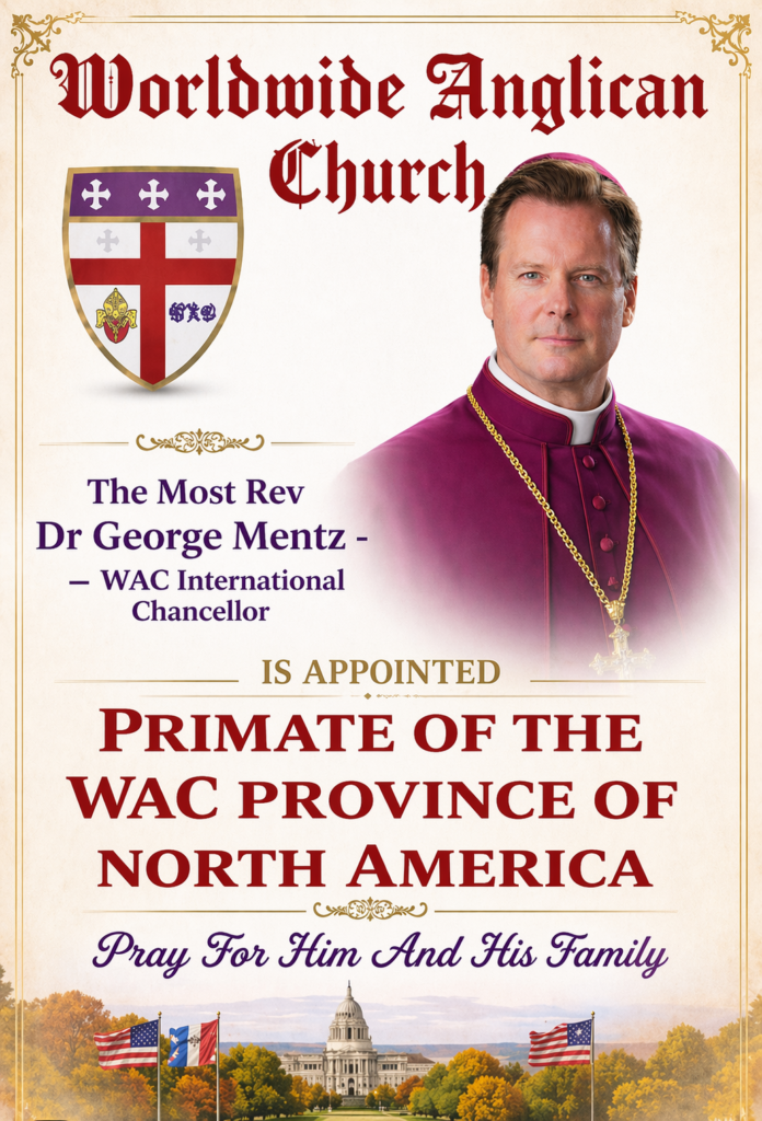 3. The Right Reverend +George Mentz, serving as WAC International Chancellor, is elevated to the rank of Archbishop and appointed Primate of the WAC Province of North America, in recognition of his leadership, service, and commitment to the Church’s global mission.